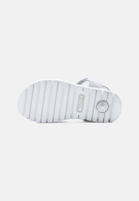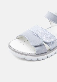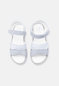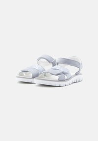 Ασημένιο-γκρι σανδάλι παιδικό με δύο ρυθμιζόμενους ιμάντες Velcro και χοντρή λευκή σόλα με ραβδώσεις, εμφανίζεται από το πλάι σε απλό φόντο.