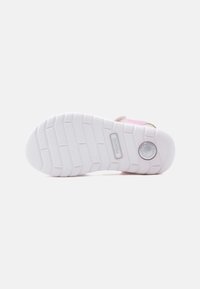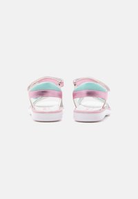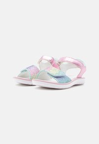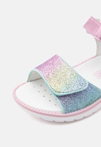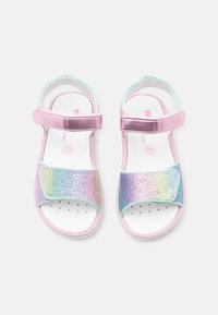Παιδικό σανδάλι με μπροστινό λουράκι με γκλίτερ ουράνιου τόξου, ροζ μεταλλικό λουράκι αστραγάλου, λευκή σόλα και ρυθμιζόμενα κλείσιμο με βέλκρο.