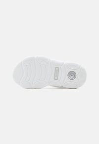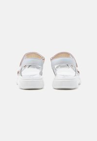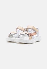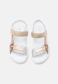 Λευκό σανδάλι με παχύ, υφή σόλας, μπεζ και ροζ χρυσές λουρίδες και ρυθμιζόμενες κλειδαριές βέλκρο, εμφανισμένο από το πλάι σε απλό φόντο.