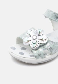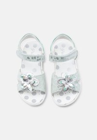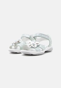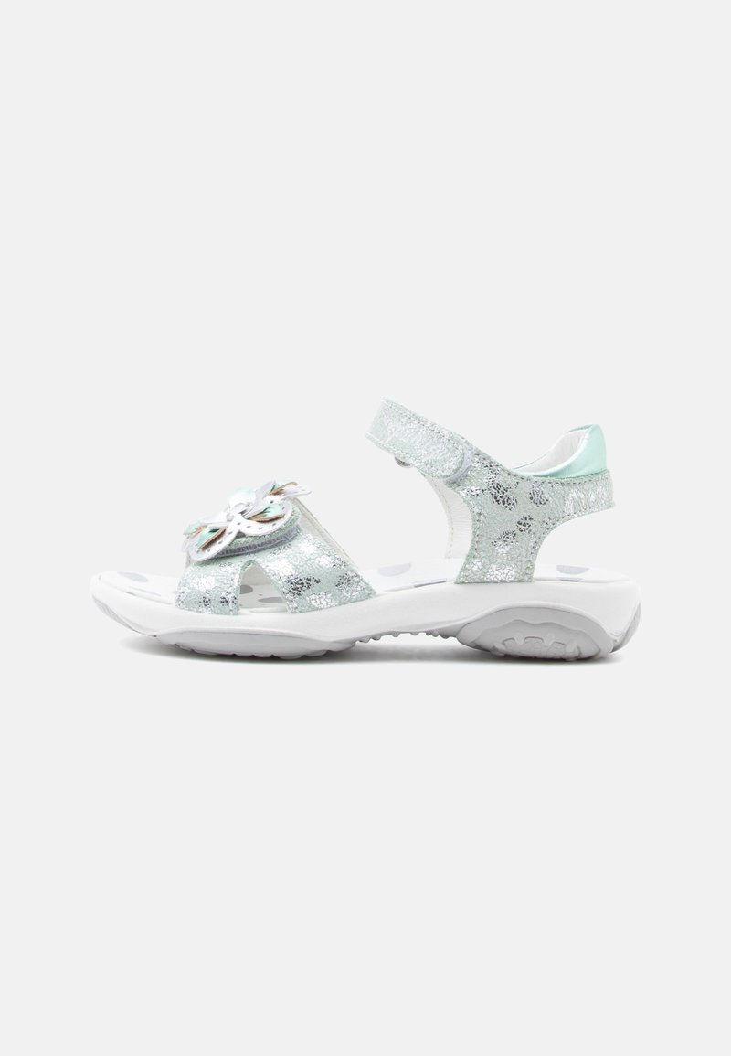 Ασημένιο παιδικό σανδάλι με ρυθμιζόμενο λουράκι στον αστράγαλο, διακόσμηση πεταλούδα στο εμπρός μέρος και λευκή υφή στην σόλα.
