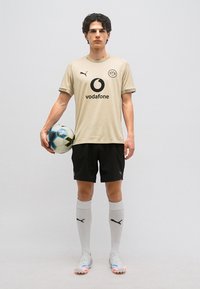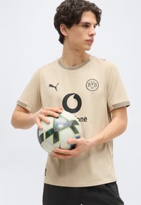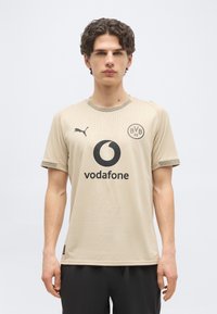 Νεαρός άνδρας που φοράει μπεζ φανέλα ποδοσφαίρου Puma Borussia Dortmund με λογότυπο Vodafone, στέκεται μπροστά σε απλό λευκό φόντο.