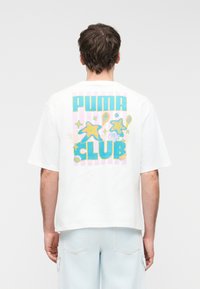 Άνδρας που φοράει λευκό υπερμεγέθες T-shirt με πολύχρωμο κείμενο "PUMA CLUB" και γραφικά αστερία, κοχυλιών και ρακέτας τένις στην πλάτη.
