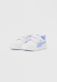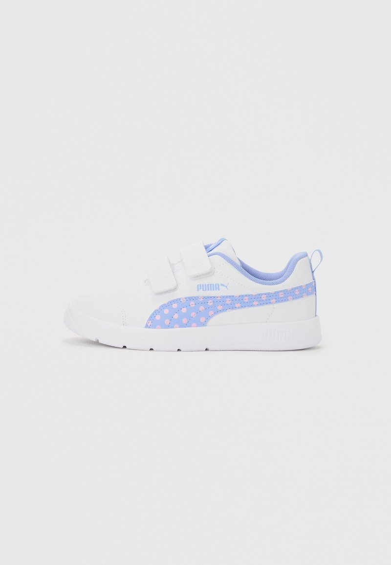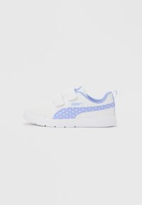Άσπρο αθλητικό παπούτσι Puma με ρίγα από ανοιχτό μπλε και ροζ πουά, δύο λουράκια με βέλκρο και λευκή σόλα σε απλό φόντο.