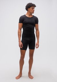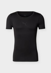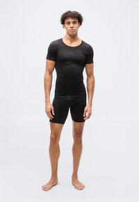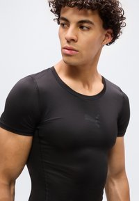 Νεαρός άνδρας με σγουρά μαλλιά, ντυμένος με εφαρμοστό μαύρο αθλητικό μπλουζάκι και σορτς Puma, στέκεται μπροστά σε απλό ανοιχτογκρι φόντο.