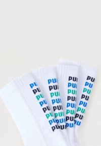 Πέντε ζεύγη λευκές κάλτσες πάτου, στοιβαγμένες, κάθε μία με το κείμενο "PUMA" σε μπλε, πράσινο και μαύρο στο πλάι.