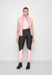 Ροζ αμάνικο μπουφάν με ψηλό γιακά, μπροστινό φερμουάρ, δύο πλαϊνές τσέπες και μαύρες λεπτομέρειες. Φοριέται πάνω από πουκάμισο με μοτίβο και κοντό μανίκι.