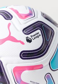 Λευκή μπάλα ποδοσφαίρου Puma Premier League με ροζ, μπλε και μαύρα αφηρημένα σχέδια σε μονόχρωμο φόντο.