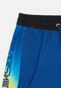 Μπλε μαγιό σορτς με μαύρη ελαστική μέση, κορδόνια, πλαϊνές τσέπες και λογότυπο Quiksilver με διαβάθμιση από κίτρινο σε μπλε στα πλαϊνά.