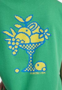 Άτομο με κοντά κατσαρά μαλλιά που φοράει πράσινο πουκάμισο με σχέδιο pixel art από φρουτοσαλάτα σε κίτρινο και μπλε στο πίσω μέρος.