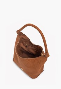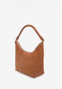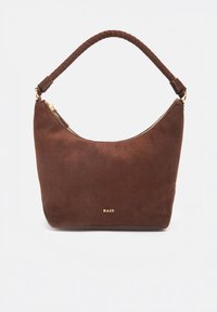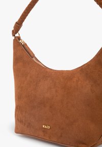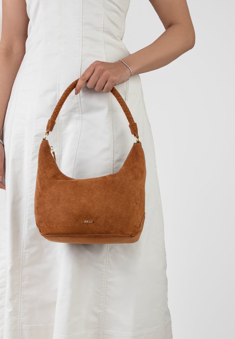 Γυναίκα με λευκό φόρεμα κρατά καφέ σουέτ τσάντα χειρός με πλεγμένη λαβή και χρυσά μεταλλικά στοιχεία, με την ετικέτα "RAID" στο κέντρο μπροστά.