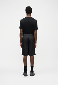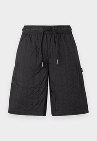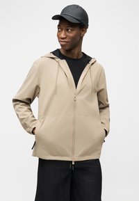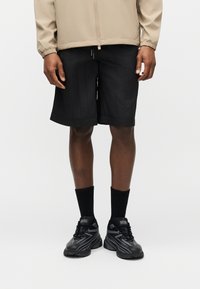 Άτομο που φοράει μπεζ μπουφάν, μαύρα σορτς μέχρι το γόνατο, μαύρες κάλτσες και μαύρα αθλητικά παπούτσια Diesel, στέκεται μπροστά σε λευκό φόντο.