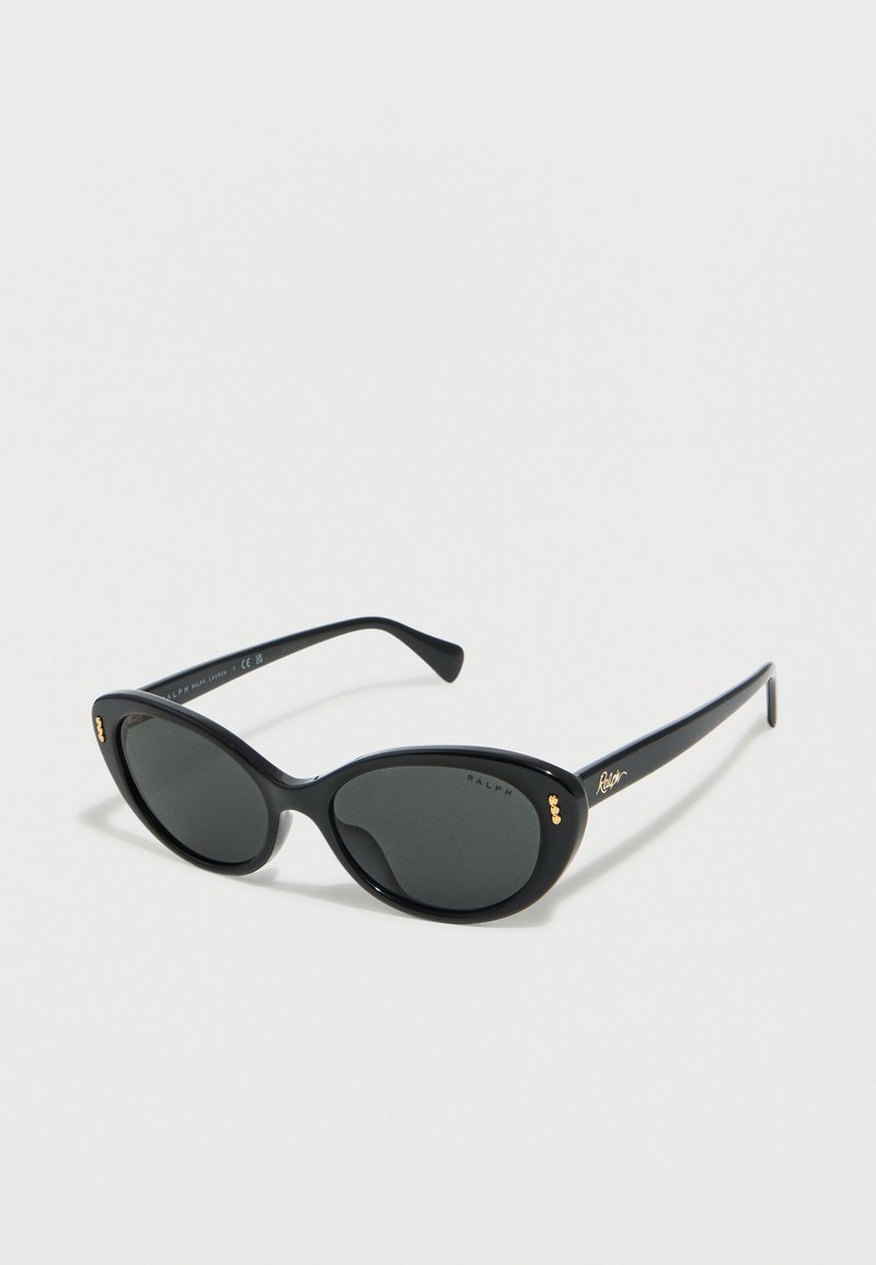 Μαύρα οβάλ γυαλιά ηλίου με σκούρους φακούς τοποθετημένα δίπλα σε μια μαύρη σκληρή θήκη με ανάγλυφο το λογότυπο "Ralph Ralph Lauren".