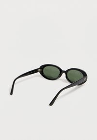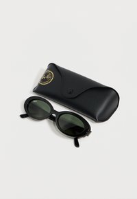 Μαύρα οβάλ γυαλιά ηλίου Ray-Ban με φακούς με πράσινη απόχρωση και λεπτά πλαίσια, τοποθετημένα λοξά σε λευκή επιφάνεια.