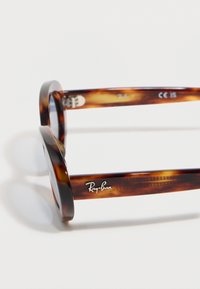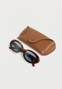 Οβάλ γυαλιά ηλίου σε χρώμα χελωνόσκεπης με μπλε φακούς και το λογότυπο Ray-Ban στο πλάι, τοποθετημένα σε λευκό φόντο.