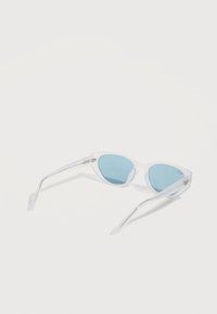 Γυαλιά ηλίου με διαφανές πλαίσιο, στρογγυλεμένους μπλε φακούς και λεπτούς βραχίονες που ακουμπούν σε λευκή επιφάνεια.