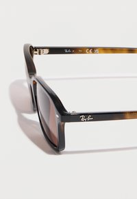 Ορθογώνια καφέ αποχρωματισμένα γυαλιά ηλίου με μαύρα και μοτίβο χελώνας σκελετούς, λογότυπο Ray-Ban στα πλαινά και φακό.
