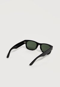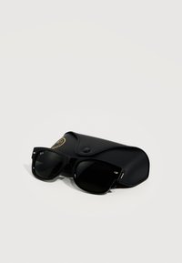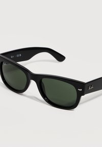 Μαύρα γυαλιά ηλίου Ray-Ban Wayfarer με σκούρους πράσινους φακούς και χαρακτηριστικό λογότυπο στα πλαϊνά, τοποθετημένα σε ανοιχτόχρωμη επιφάνεια.