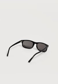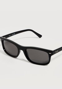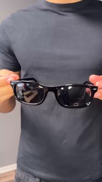 Μαύρα ορθογώνια γυαλιά ηλίου Ray-Ban με σκούρους φακούς, ακουμπισμένα σε ανοιχτόχρωμη επιφάνεια.