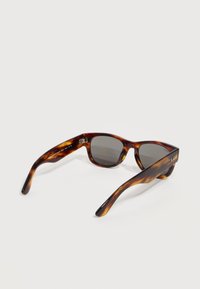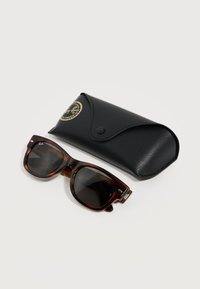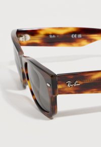Γυαλιά ηλίου Ray-Ban με καβούκι χελώνας, ορθογώνιους σκούρους φακούς και ασημένιες πριτσίνες στις γωνίες του εμπρόσθιου σκελετού.