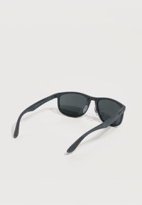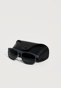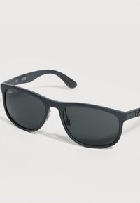 Μαύρα ορθογώνια γυαλιά ηλίου Ray-Ban με σκοτεινούς φακούς και λεπτούς βραχίονες να ακουμπούν σε λευκή επιφάνεια.