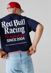 Άτομο με κοντά ξανθά μαλλιά φοράει μπλε σκούρο t-shirt Red Bull Racing με λευκό και κόκκινο κείμενο, ανοιχτό μπλε τζιν και μαύρα αθλητικά παπούτσια, στέκεται με την πλάτη στραμμένη.