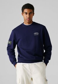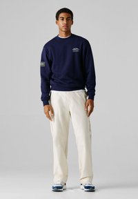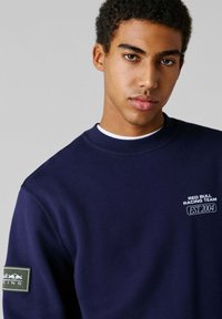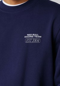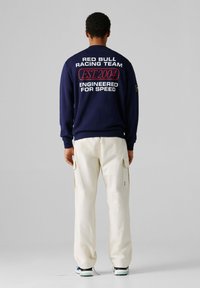 Άνδρας όρθιος με την πλάτη, φορώντας μπλε σκούρα μπλούζα με την επιγραφή "Red Bull Racing Team EST. 2004 Engineered for Speed", μπεζ παντελόνι cargo και αθλητικά παπούτσια.