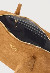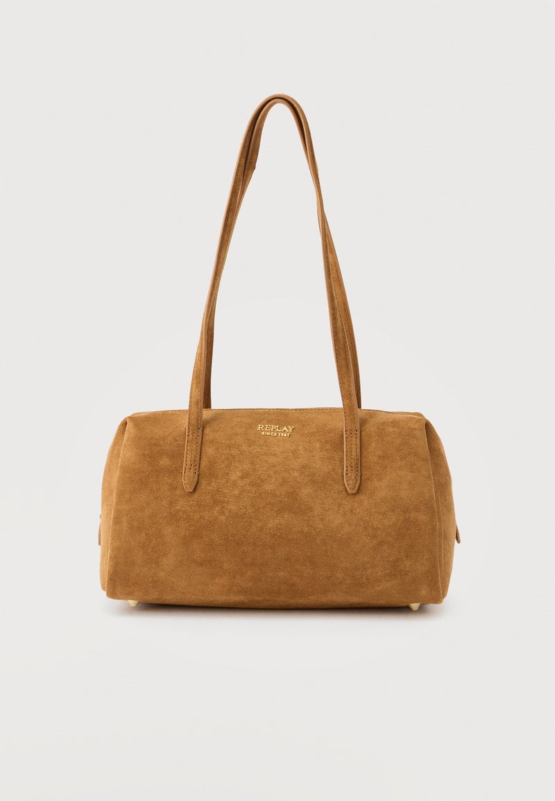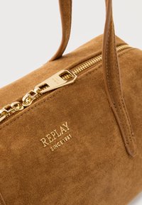 Καφέ σουέντ ορθογώνια τσάντα χειρός με δύο μακριούς ιμάντες και μικρό χρυσό κείμενο "REPLAY" στο κέντρο της μπροστινής πλευράς.