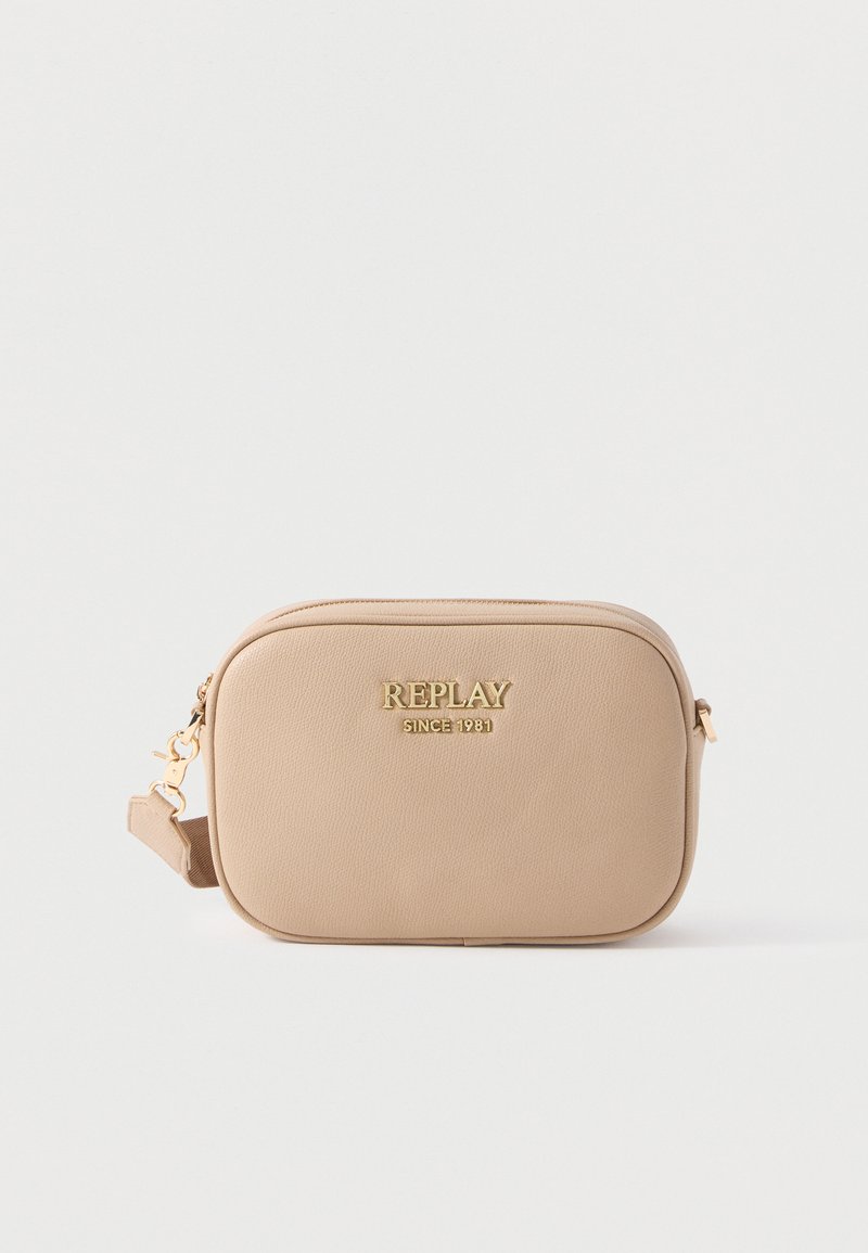 Μπεζ ορθογώνιο δερμάτινο τσαντάκι χιαστί με χρυσό λογότυπο «REPLAY SINCE 1981» και ρυθμιζόμενο λουράκι με χρυσά εξαρτήματα.