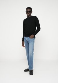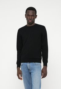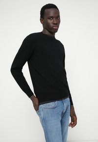 Μαύρο πουλόβερ με στρογγυλή λαιμόκοψη και μακριά μανίκια, φτιαγμένο από μαλακό πλεκτό ύφασμα. Συνδυάζεται με ανοιχτού μπλε τζιν παντελόνι. Μινιμαλιστικός σχεδιασμός, χωρίς ορατά σχέδια.