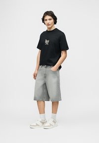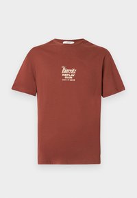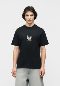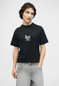 Άτομο με κοντά σκούρα μαλλιά που φοράει μαύρο T-shirt με πορτοκαλί και λευκό κείμενο και γραφικά cocktail bar στην πλάτη.