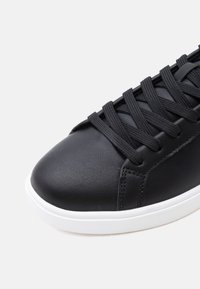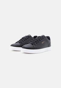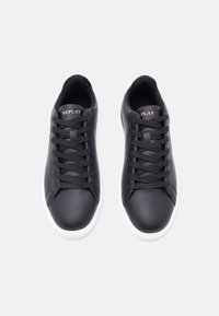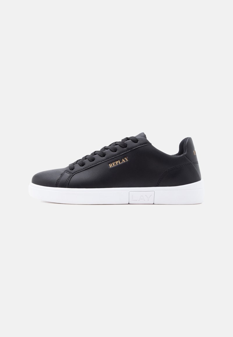 Μαύρο αθλητικό παπούτσι χαμηλού ύψους με μαύρα κορδόνια, λευκή σόλα και χρυσό λογότυπο «Replay» στο πλευρό και το πίσω μέρος, πάνω σε απλό λευκό φόντο.