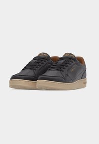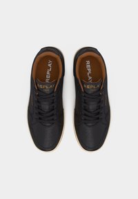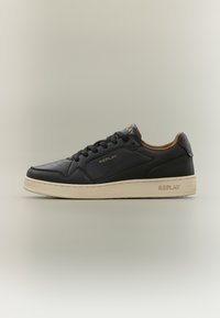 Μαύρο χαμηλό αθλητικό παπούτσι με μπεζ σόλα, μαύρα κορδόνια και το λογότυπο «REPLAY» σε χρυσό στη πλευρά, στη γλώσσα και στον γιακά της φτέρνας.