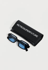 Μαύρα ορθογώνια γυαλιά ηλίου με φωτεινούς γαλάζιους φακούς και λεπτούς βραχίονες, λογότυπο "RSF" στο πλάι, παρουσιάζονται σε λευκό φόντο.