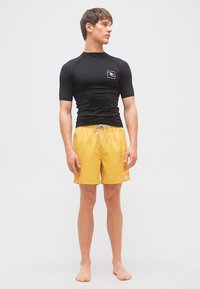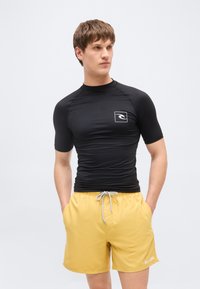 Άνδρας που φοράει εφαρμοστή μαύρη κοντομάνικη μπλούζα με λογότυπο και κίτρινα μαγιό με κορδόνι, στέκεται μπροστά σε απλό ανοιχτό φωτισμένο φόντο.