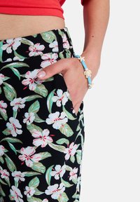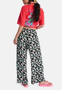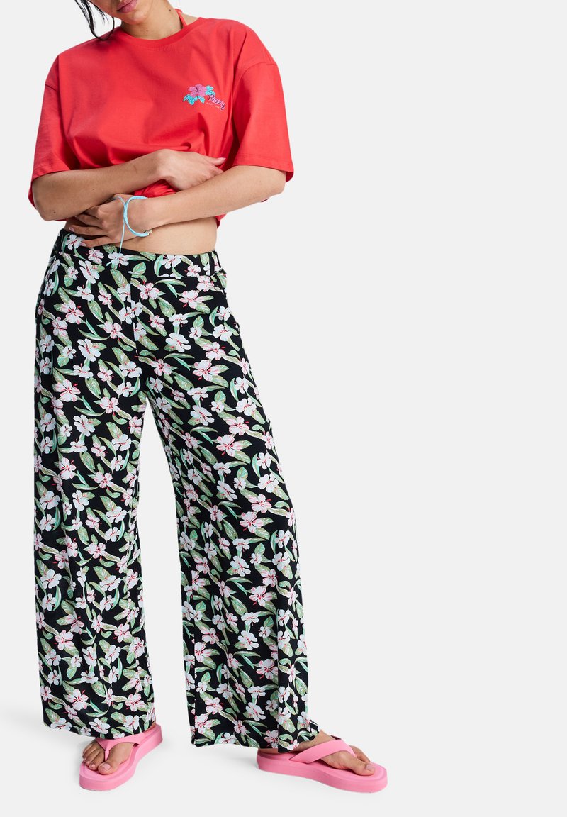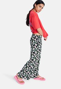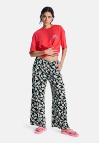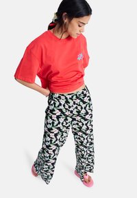 Γυναίκα που φοράει κόκκινο κοντό μπλουζάκι, μαύρο φαρδύ παντελόνι με λουλούδια, ροζ σανδάλια με πλατφόρμα και μπλε βραχιόλι με κορδόνι, στέκεται με σταυρωμένα τα χέρια.
