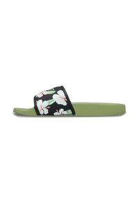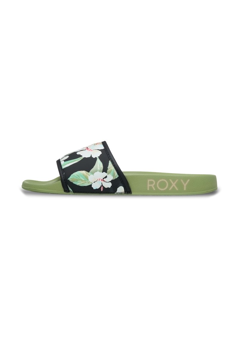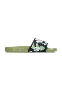 Παντόφλα με σόλα από πράσινο λάστιχο, διαθέτει μαύρο λουρί με λουλούδια σε λευκό και πράσινα φύλλα· το όνομα της μάρκας «ROXY» τυπωμένο σε χρυσό.