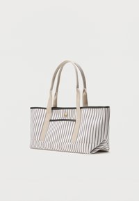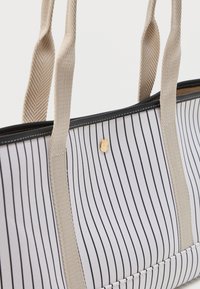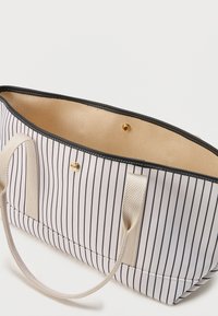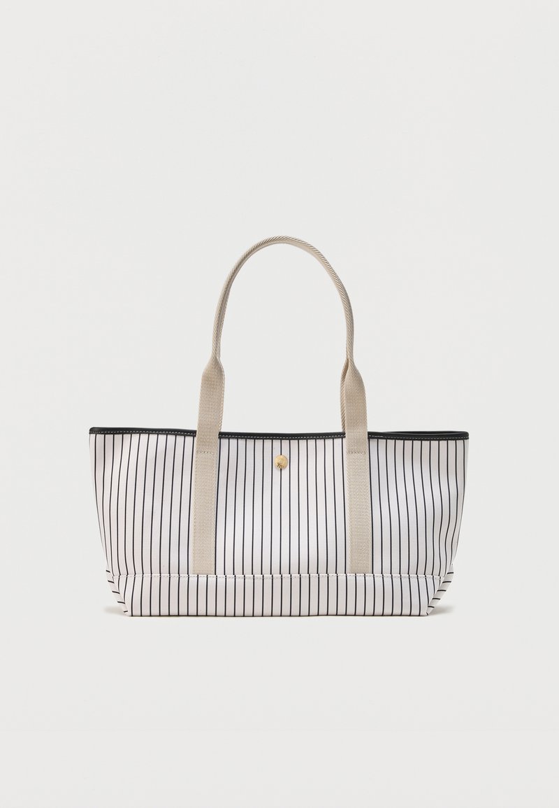 Λευκή τσάντα tote με κάθετες μαύρες ρίγες, μπεζ χερούλια και ένα μικρό κεντρικό χρυσό κουμπί κλεισίματος σε απλό φόντο.