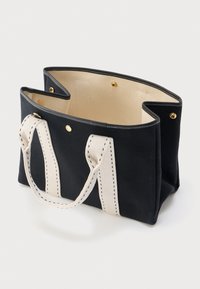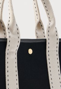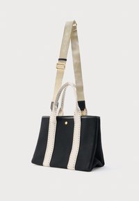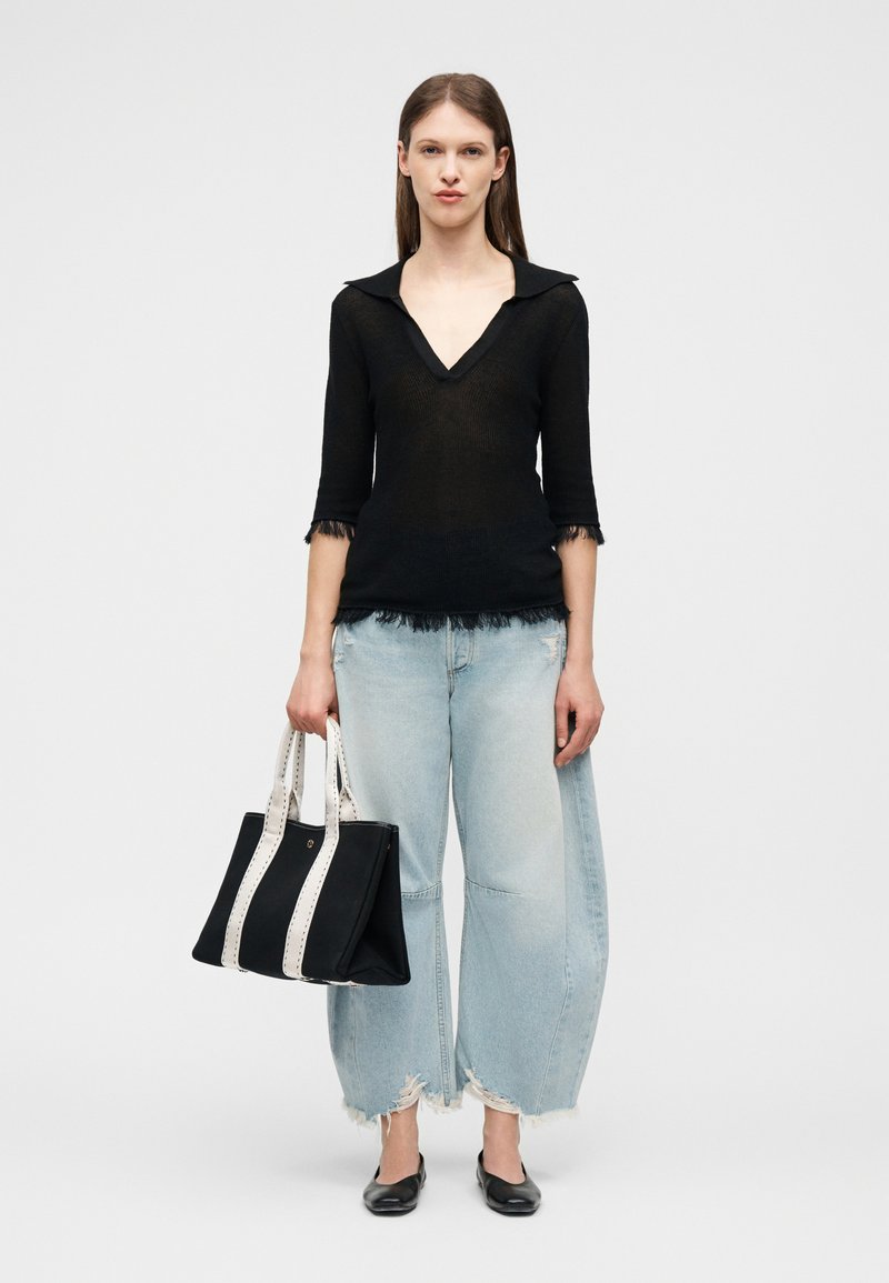 Γυναίκα που φοράει μαύρη μπλούζα με ντεκολτέ σε σχήμα V, ανοιχτό μπλε τζιν παντελόνι με φαρδιά πόδια και σκισίματα, μαύρα φλατ παπούτσια, κρατώντας μια μαύρη τσάντα ώμου με λευκές λουρίδες.