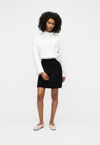 Άτομο που φοράει λευκό πουκάμισο με λωρίδες, μαύρη μίνι φούστα ψηλόμεση και ανοιχτό μπεζ επίπεδα παπούτσια, στέκεται μπροστά σε απλό ανοιχτό φόντο.
