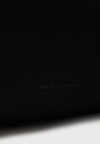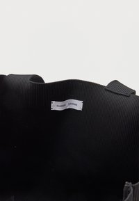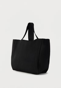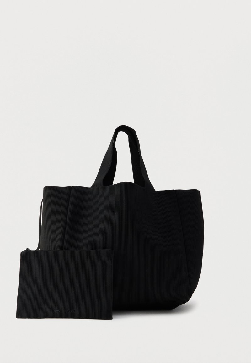 Μαύρη υφή τσάντα tote με δύο κοντές λαβές, συνοδευόμενη από μια αντίστοιχη ορθογώνια θήκη με φερμουάρ, στη λευκή βάση.