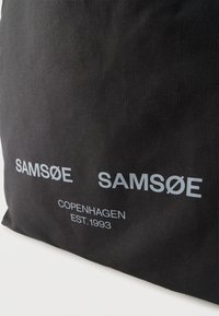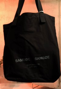 Μαύρη υφασμάτινη τσάντα χειρός με δύο χερούλια, με εκτύπωση "SAMSOE SAMSOE" και "Copenhagen EST. 1993" σε ανοιχτό γκρι στο μπροστινό μέρος.