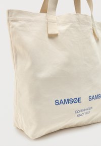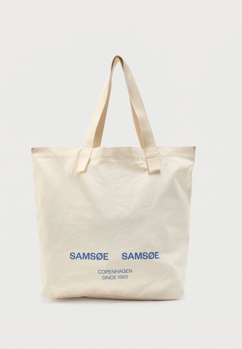 Μπεζ καμβά τσάντα με δύο λαβές και μπλε κείμενο που γράφει "SAMSØE SAMSØE COPENHAGEN SINCE 1993" στο κέντρο της μπροστινής πλευράς.