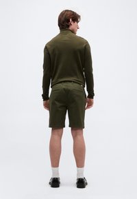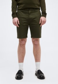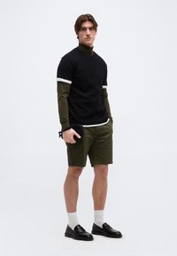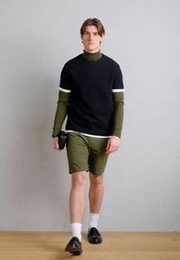 Άνδρας που φοράει χακί πράσινα σορτς, μαύρα μοκασίνια, λευκές κάλτσες και χακί πράσινο πουκάμισο με μακριά μανίκια και μαύρο γιλέκο στέκεται σε ξύλινο πάτωμα.