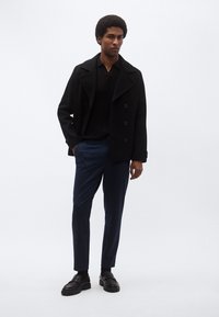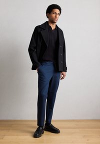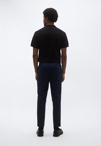 Παντελόνια σε σκούρο μπλε ναυτικό χρώμα με λεία υφή, διαθέτουν κορδόνι στη μέση και στενή εφαρμογή, συνδυασμένα με μαύρα loafers.
