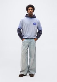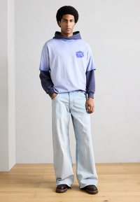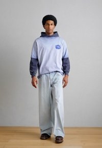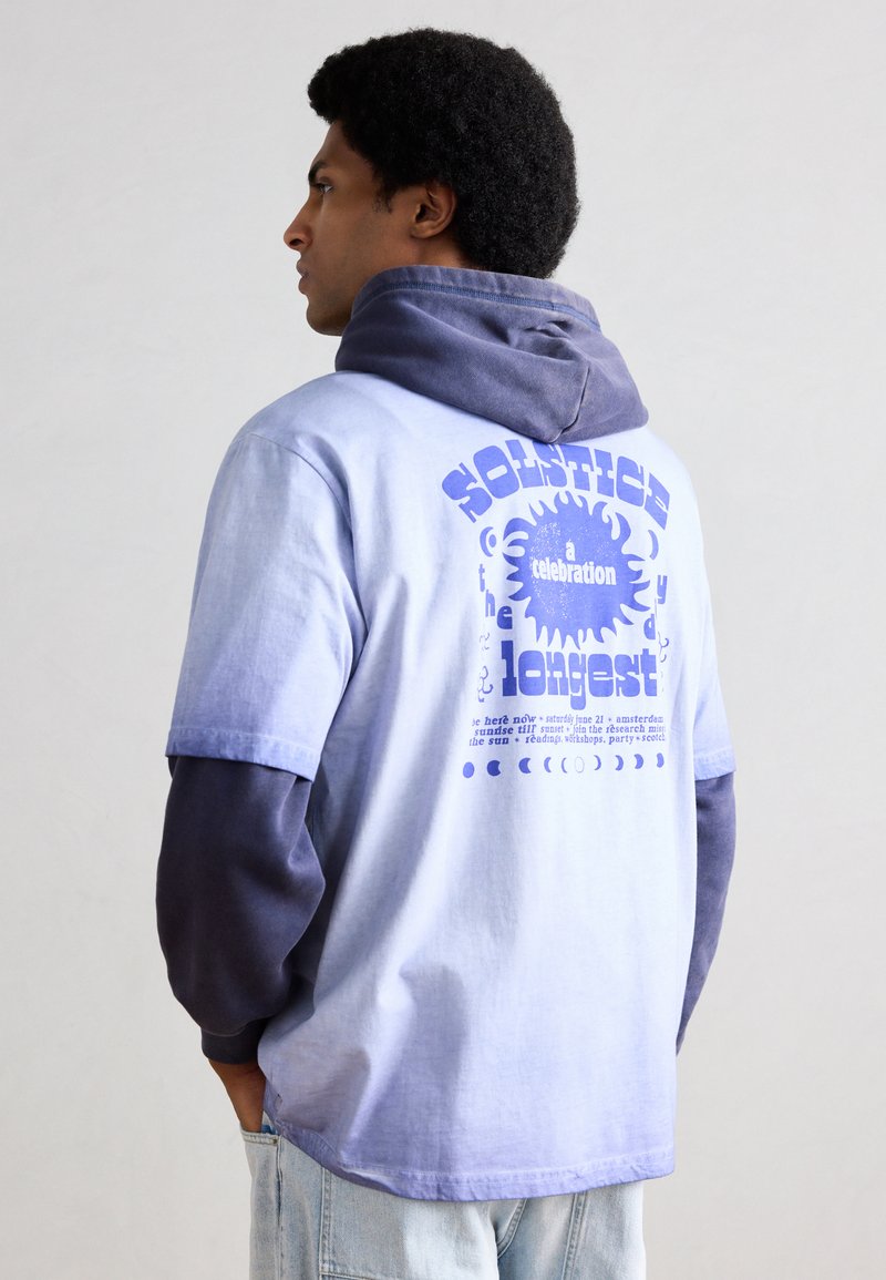 Νεαρός άνδρας με αφροκαστό χτένισμα, φορώντας μια μπλούζα με κουκούλα πολλών στρωμάτων σε μπλε χρώμα και ένα T-shirt με μοβ γραφικό κείμενο με θέμα το ηλιοστάσιο στην πλάτη.
