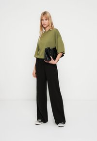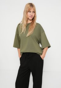 Λαδί βαμβακερό T-shirt με χαλαρή εφαρμογή, κοντά μανίκια και στρογγυλή λαιμόκοψη, συνδυασμένο με μαύρο φαρδύ παντελόνι.