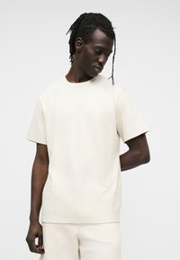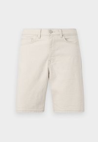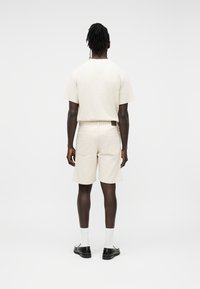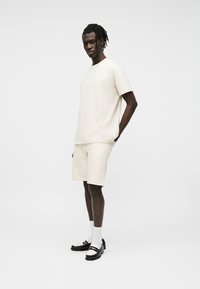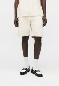 Άνδρας που φοράει σορτς και πουκάμισο σε κρεμ χρώμα με λευκές κάλτσες και μαύρα-λευκά μοκασίνια, στέκεται μπροστά σε απλό φόντο.