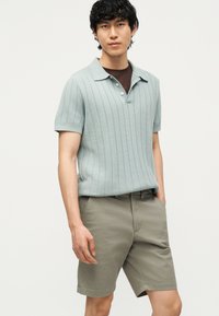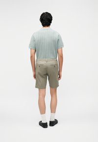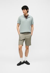 Άνδρας που φοράει μπεζ βερμούδα μέχρι το γόνατο, λευκές κάλτσες μέχρι τον αστράγαλο, μαύρα παπούτσια χωρίς κορδόνια και αμάνικο ανοιχτογκρι ριμπ πουκάμισο.