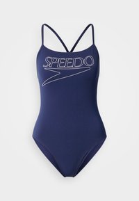 Μαγιό ολόσωμο σε ναυτικό μπλε χρώμα με λεπτές τιράντες, που διαθέτει εμφανές λευκό λογότυπο "SPEEDO" μπροστά και έχει λεία, ελαστική υφή.