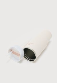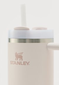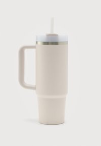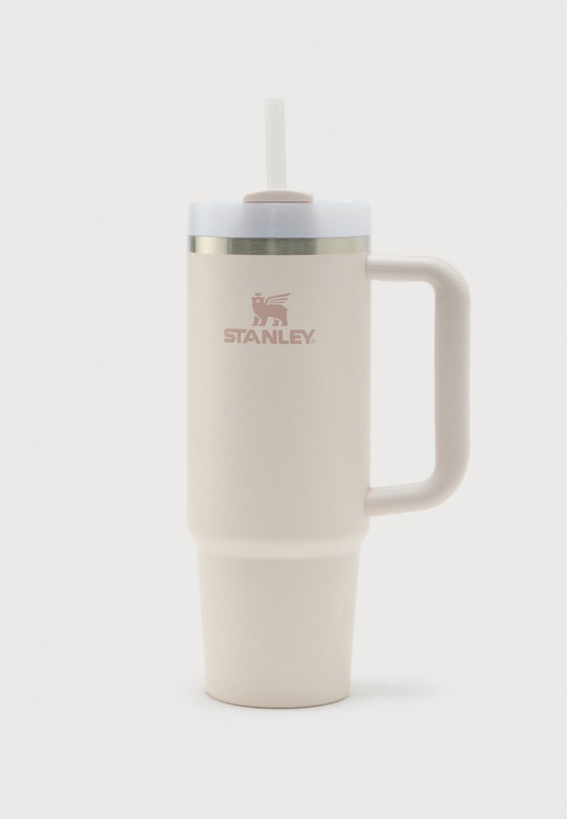 Ψηλό μπεζ μονωμένο κύπελλο Stanley με λαβή, λευκό καπάκι και διαφανές καλαμάκι, σχεδιασμένο για ζεστά ή κρύα ροφήματα.